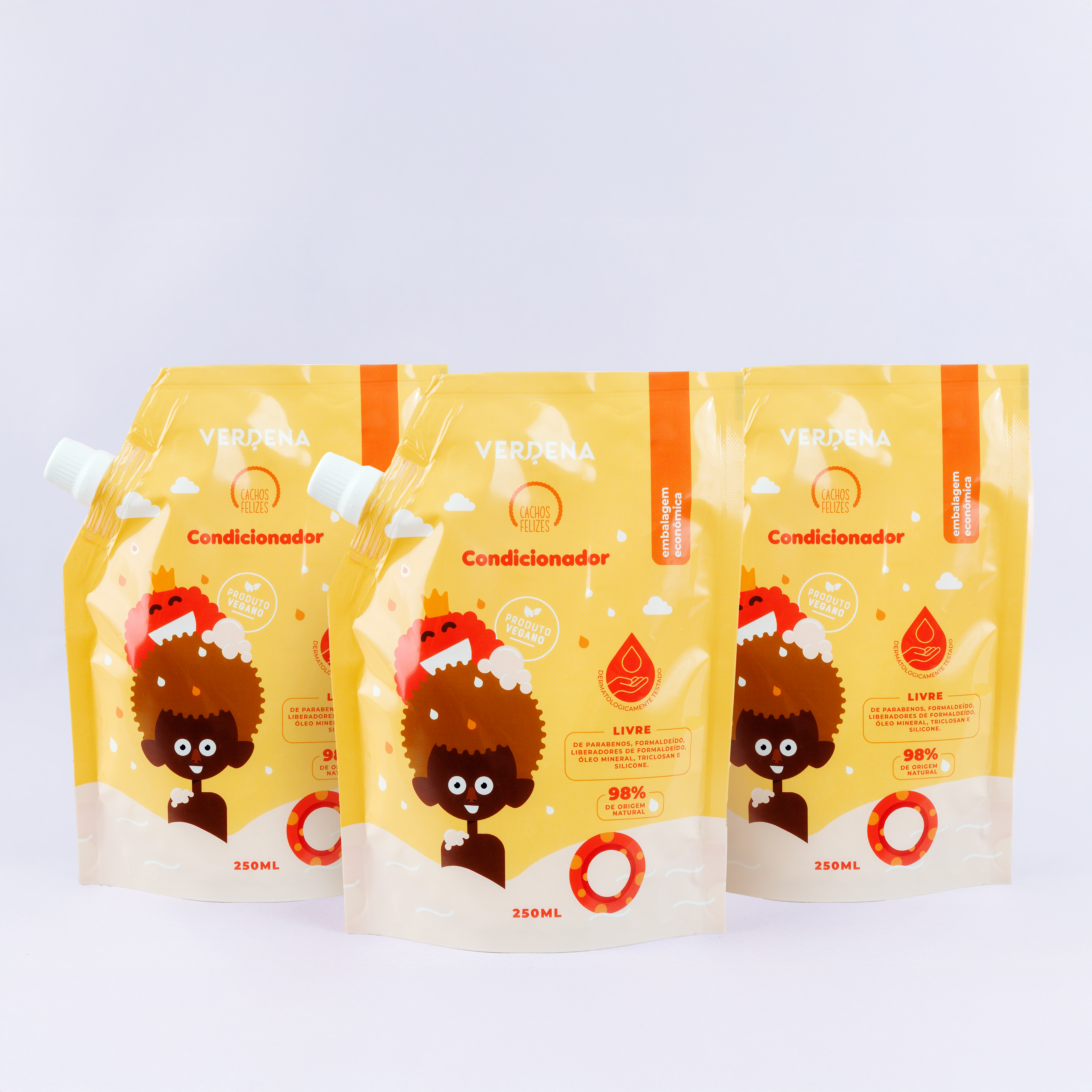 O kit contém 3 refis do Condicionador Cachos Felizes. O Condicionador Cachos Felizes é o aliado perfeito para cuidar dos cabelos cacheados e crespos das crianças. Com fórmula nutritiva à base de óleo de jojoba, óleo de coco e glicerina vegetal, desembaraça os fios sem esforço, reduz o frizz e garante cachinhos macios, definidos e cheios de movimento natural. Compre com o Frasco