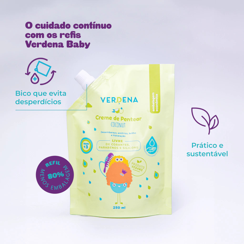 O Kit contém 3 refis do Creme de Pentear Coconut O Creme de Pentear Coconut é o aliado perfeito para manter os cabelos das crianças sempre hidratados, macios e definidos. Sua fórmula exclusiva com óleo de coco e óleo de avelã nutre e protege os fios delicados, oferecendo desembaraço fácil e definição natural, sem pesar ou agredir a pele sensível. Compre com o Frasco