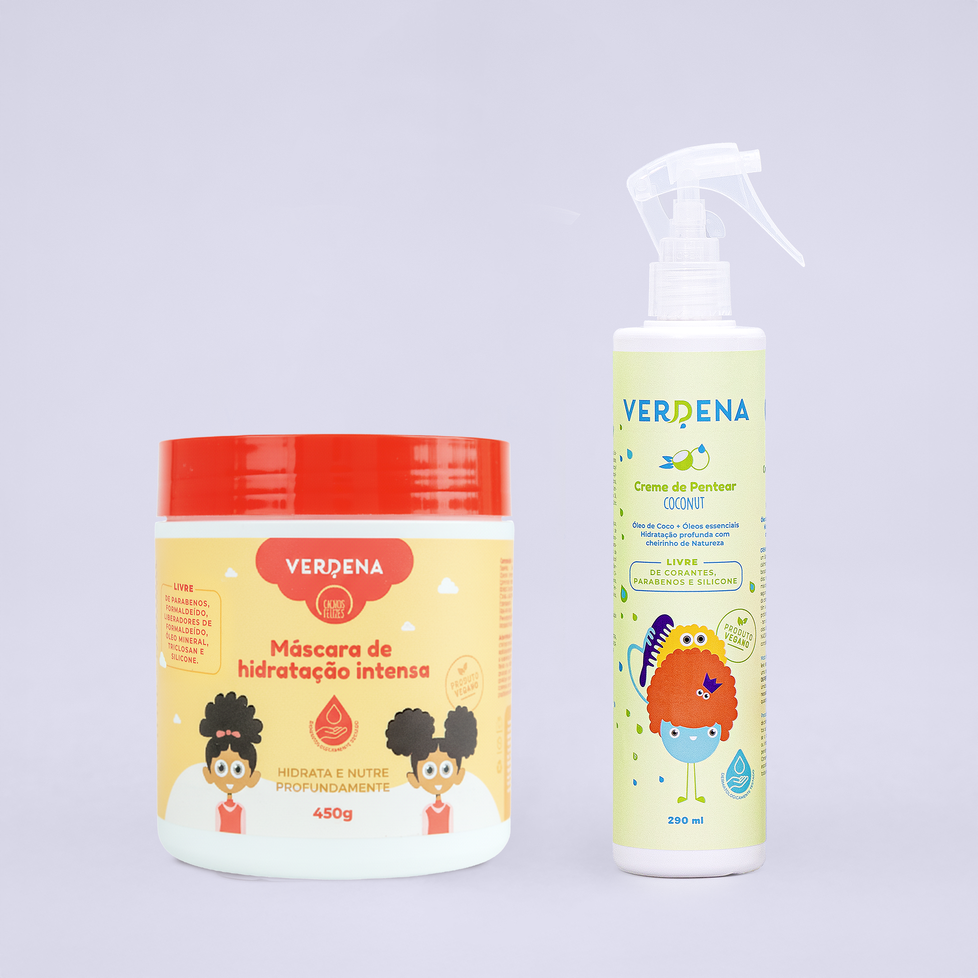 Não. Ambas as fórmulas foram desenvolvidas para serem leves e adequadas aos fios delicados das crianças. A máscara hidrata sem pesar, e o creme de pentear define e controla o frizz sem deixar resíduos.
